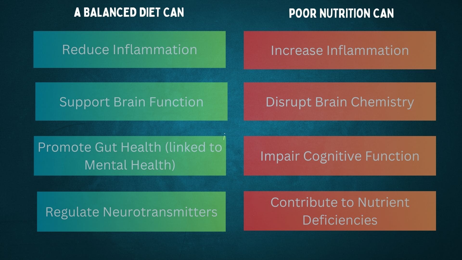 The link between mental health and diet is undeniable. Our dietary choices can significantly impact our emotional well-being, mood, and risk of developing mental health conditions like depression and anxiety. By prioritizing a balanced, nutrient-rich diet and making mindful food choices, we can support our mental health and improve our overall quality of life.