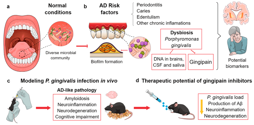First, pathogenic bacteria from the mouth can enter the bloodstream, potentially reaching the brain and influencing neural function. Research has shown that P. gingivalis, a common oral pathogen, has been found in the brains of Alzheimer's patients at rates significantly higher than in age-matched controls.